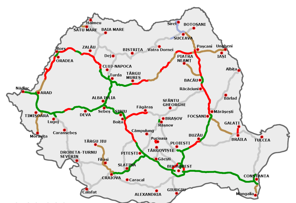 Autostrady w Rumunii są jednymi z najmniej rozwiniętych dróg w Europie. Łączna ich długość wynosi zaledwie ok. 1100 km. Duża część z nich jest nadal w trakcie budowy (ok. 720 km), co znacznie utrudnia poruszanie się po nich. Na terenie Rumunii funkcjonuje ok. 85 km dróg ekspresowych. Dokładne rozmieszczenie autostrad oraz ekspresówek sprawdzisz na poniższej mapie. Kolorem zielonym oznaczono istniejące odcinki. Czerwony oznacza trasy w budowę, a brązowy te na etapie przetargu. Na niebiesko zaznaczono fragmenty dróg, dla których wydano decyzje środowiskowe, a na szaro odcinki planowane.