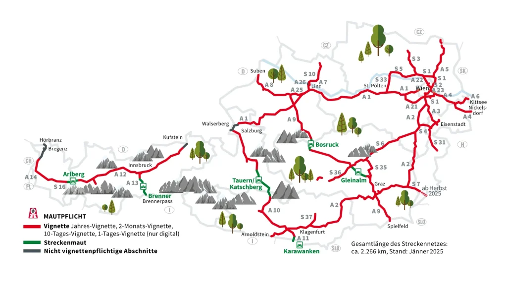 W Austrii opłaty są pobierane za przejazd niektórymi odcinkami autostrad i dróg ekspresowych, a także tunelami: Arlberg, Tauern/Katschberg, Karawanken, Bosruck, Gleinalm oraz przełęczą i mostem Brenner.